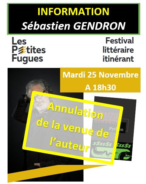 C'est avec regret que nous avons appris que suite à des problèmes de santé, Sébastien Gendron ne pourra pas participer à la rencontre prévue dans le cadre des Petites Fugues mardi prochain.
